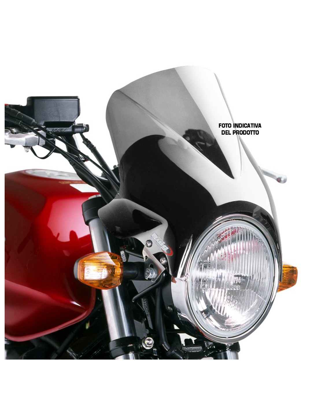 PUIG CUPOLINO UNIVERSALE MODELLO WINDY COLORE FUME' CHIARO. Realizzato per il montaggio su fari tondi con due punti di fissaggio. Diametro del faro: 20-22 cm. Dimensioni (H x L): 315 x 335 mm. Materiale: metacrilato alto impatto. Omologato T.U.V.