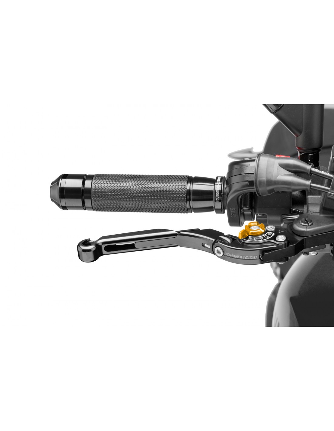 PUIG LEVA FRENO ESTENSIBILE E PIEGHEVOLE CON CORPO CENTRALE DI COLORE NERO ESTENSIONE DI COLORE NERO E SELETTORE ORO. Materiale: ergal 7075 ricavato dal pieno. Peso: 100 gr. Lunghezza: 133-153 mm. Numero di regolazioni: 6. Omologato T.U.V. (Attenzione la leva non include l'adattatore)