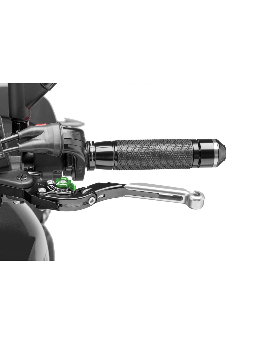 PUIG LEVA FRIZIONE ESTENSIBILE E PIEGHEVOLE CON CORPO CENTRALE DI COLORE NERO ESTENSIONE COLORE ARGENTO E SELETTORE VERDE. Materiale: ergal 7075 ricavato dal pieno. Peso: 100 gr. Lunghezza: 133-153 mm. Numero di regolazioni: 6. Omologato T.U.V. (Attenzione la leva non include l'adattatore)