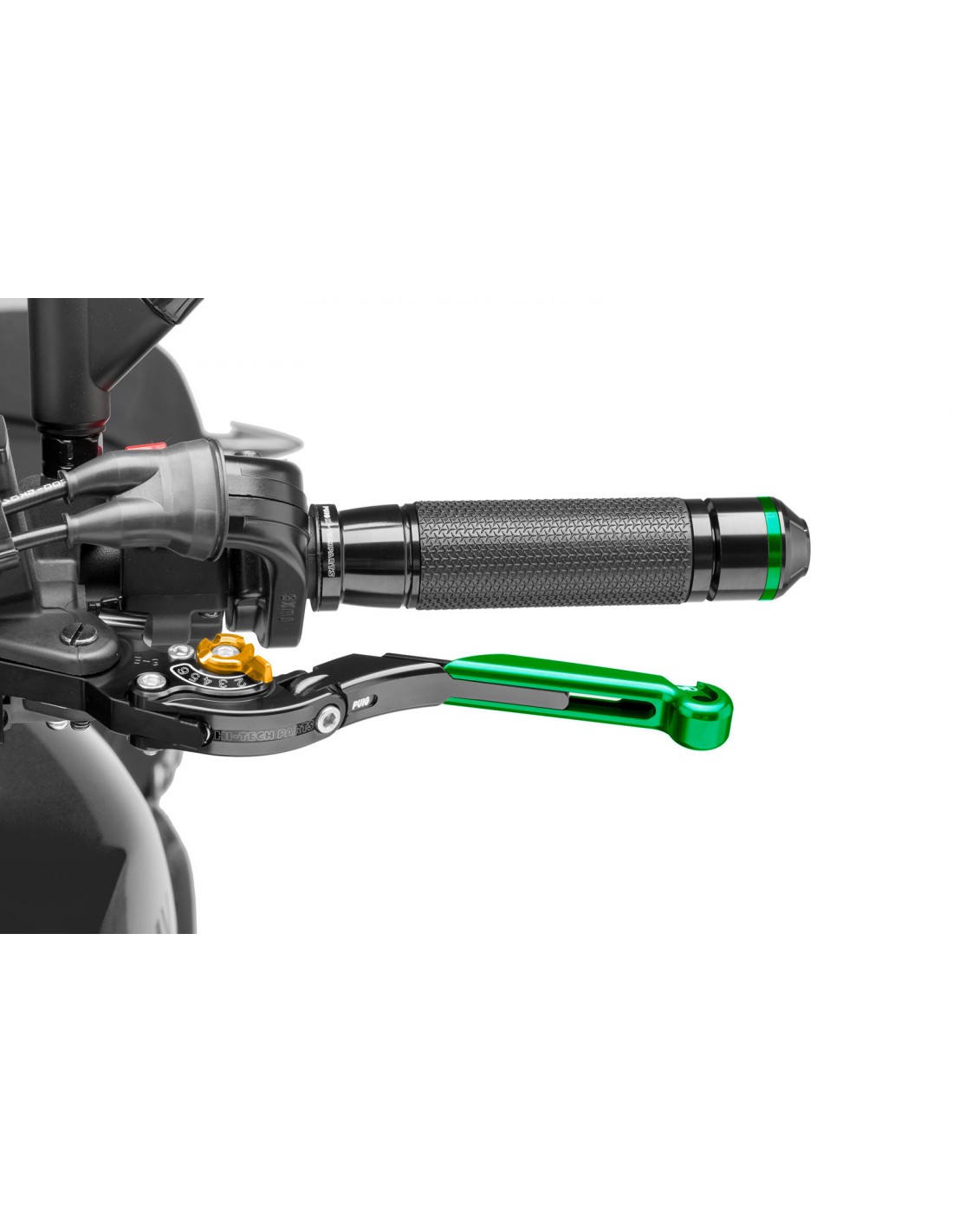 PUIG LEVA FRIZIONE ESTENSIBILE E PIEGHEVOLE CON CORPO CENTRALE DI COLORE NERO ESTENSIONE COLORE VERDE E SELETTORE ORO. Materiale: ergal 7075 ricavato dal pieno. Peso: 100 gr. Lunghezza: 133-153 mm. Numero di regolazioni: 6. Omologato T.U.V. (Attenzione la leva non include l'adattatore)