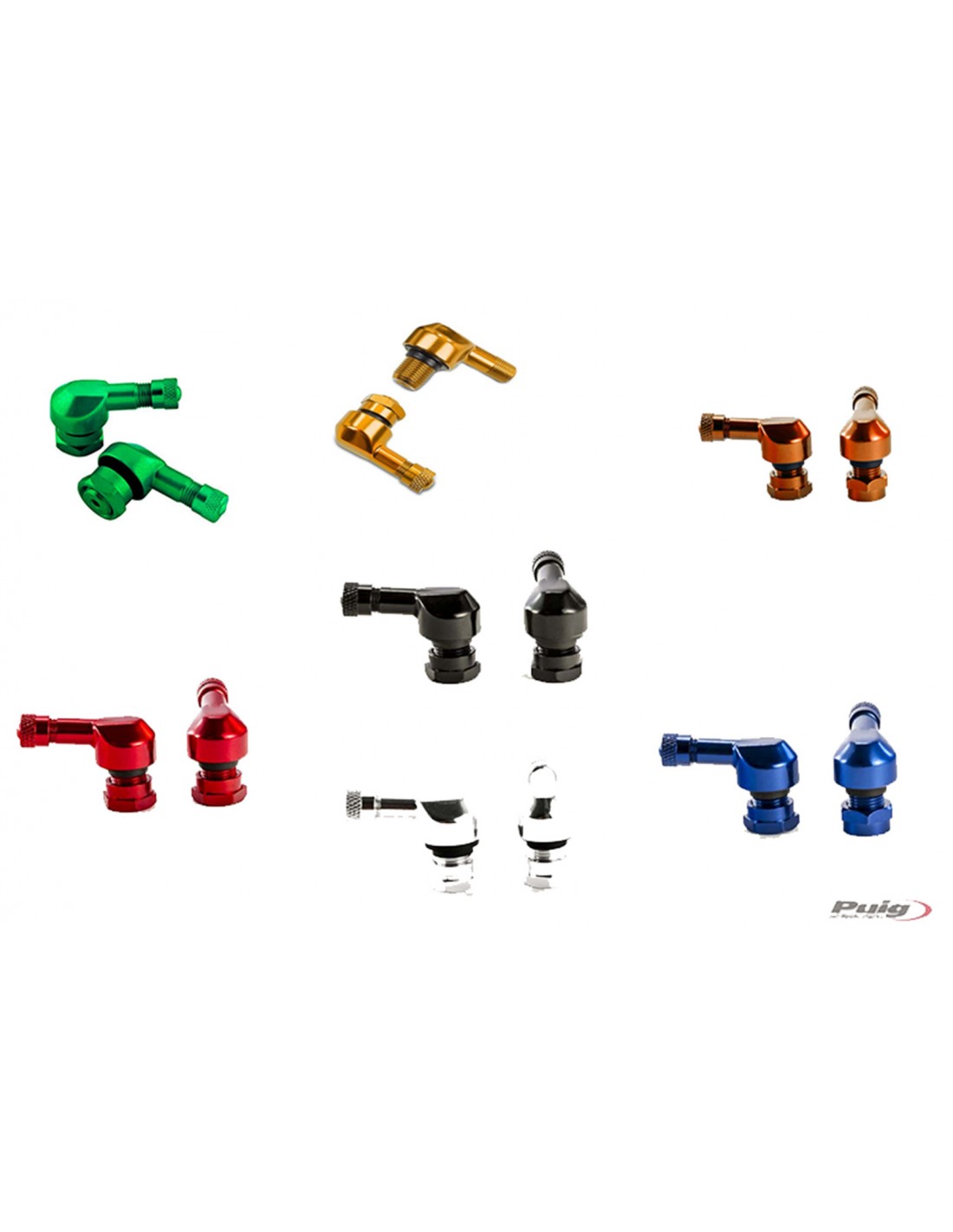 PUIG VALVOLE A 90 GRADI PER PNEUMATICI TUBELESS. Dimensioni: 39.5x27.5x17.5 mm. Realizzate in ergal, per pneumatici tubeless, piega 90 GRADI. Vendute in coppia.