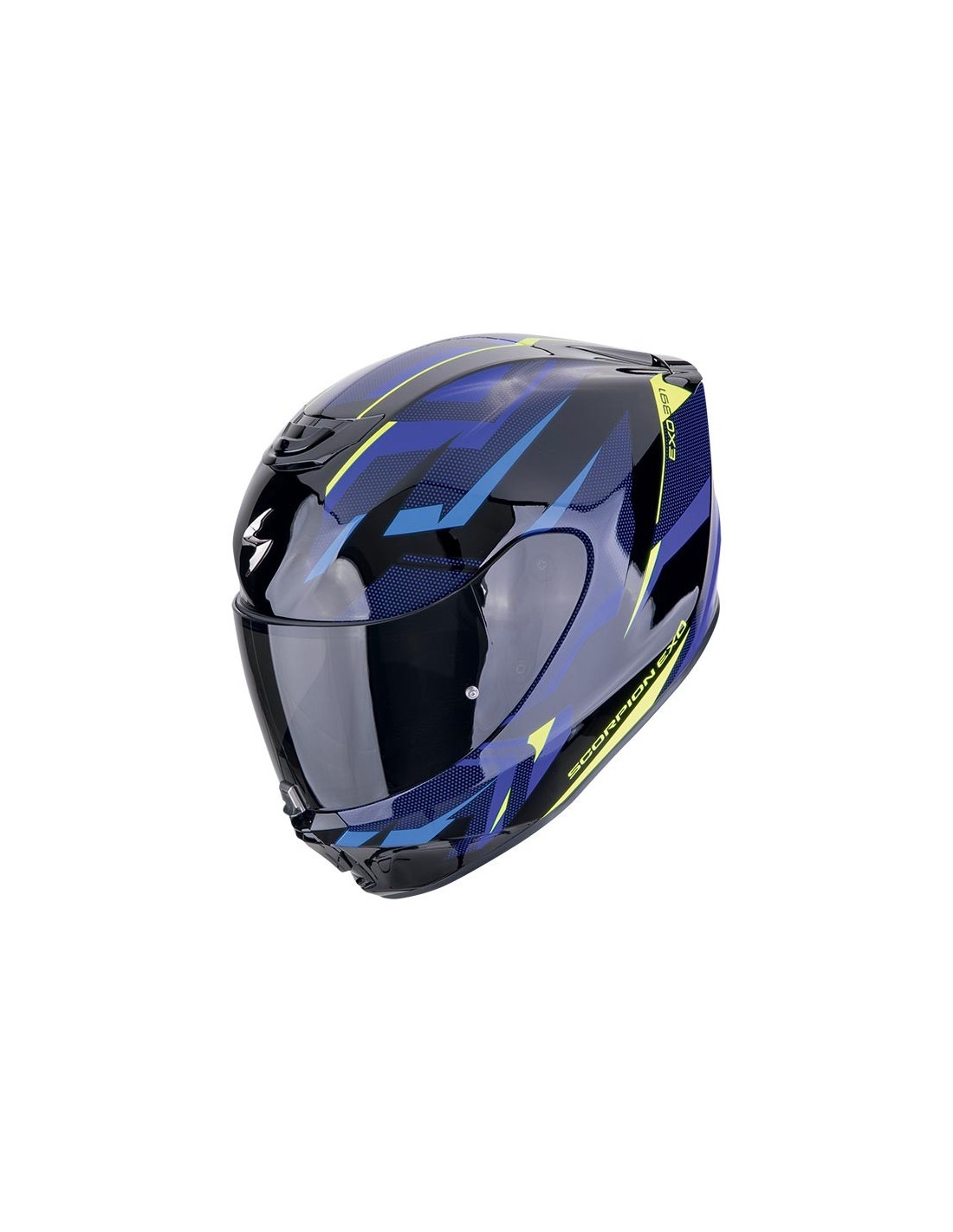 Questo è un casco moto prodotto da SCORPION nel 2024. Il colore è nero, blu e giallo. Consigliato per uso in strada.
