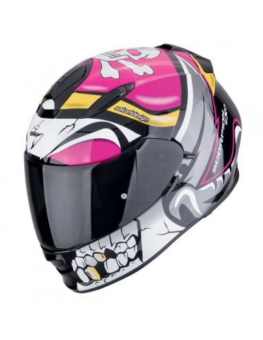 Questo è un casco moto prodotto da SCORPION nel 2024. Il colore è nero, bianco e viola. Consigliato per uso in strada.