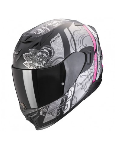 Questo è un casco moto prodotto da SCORPION nel 2024. Il colore è nero, argento e rosa. Consigliato per uso in strada.