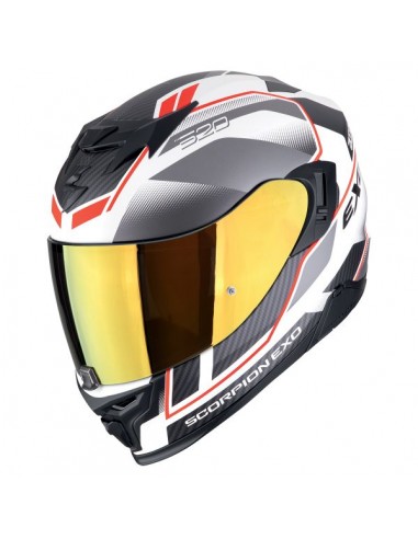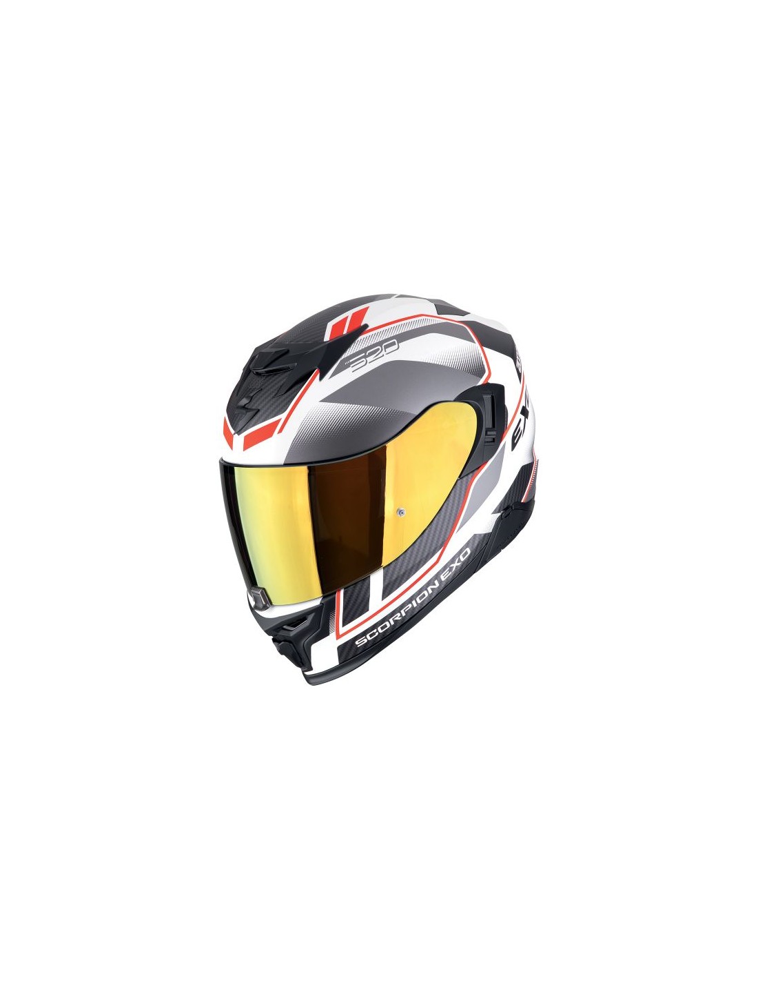 Questo è un casco moto prodotto da SCORPION nel 2024. Il colore è bianco, rosso e grigio. Consigliato per uso in strada.