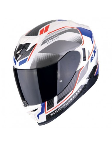 Questo è un casco moto prodotto da SCORPION nel 2024. Il colore è bianco, blu e grigio. Consigliato per uso in strada.