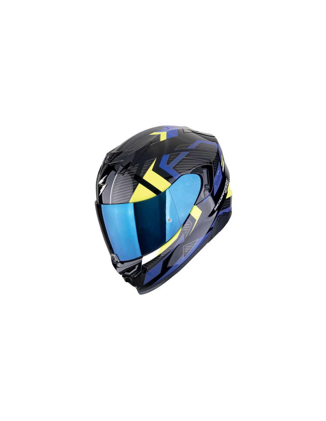 Questo è un casco moto prodotto da SCORPION nel 2024. Il colore è nero, giallo e blu. Consigliato per uso in strada.