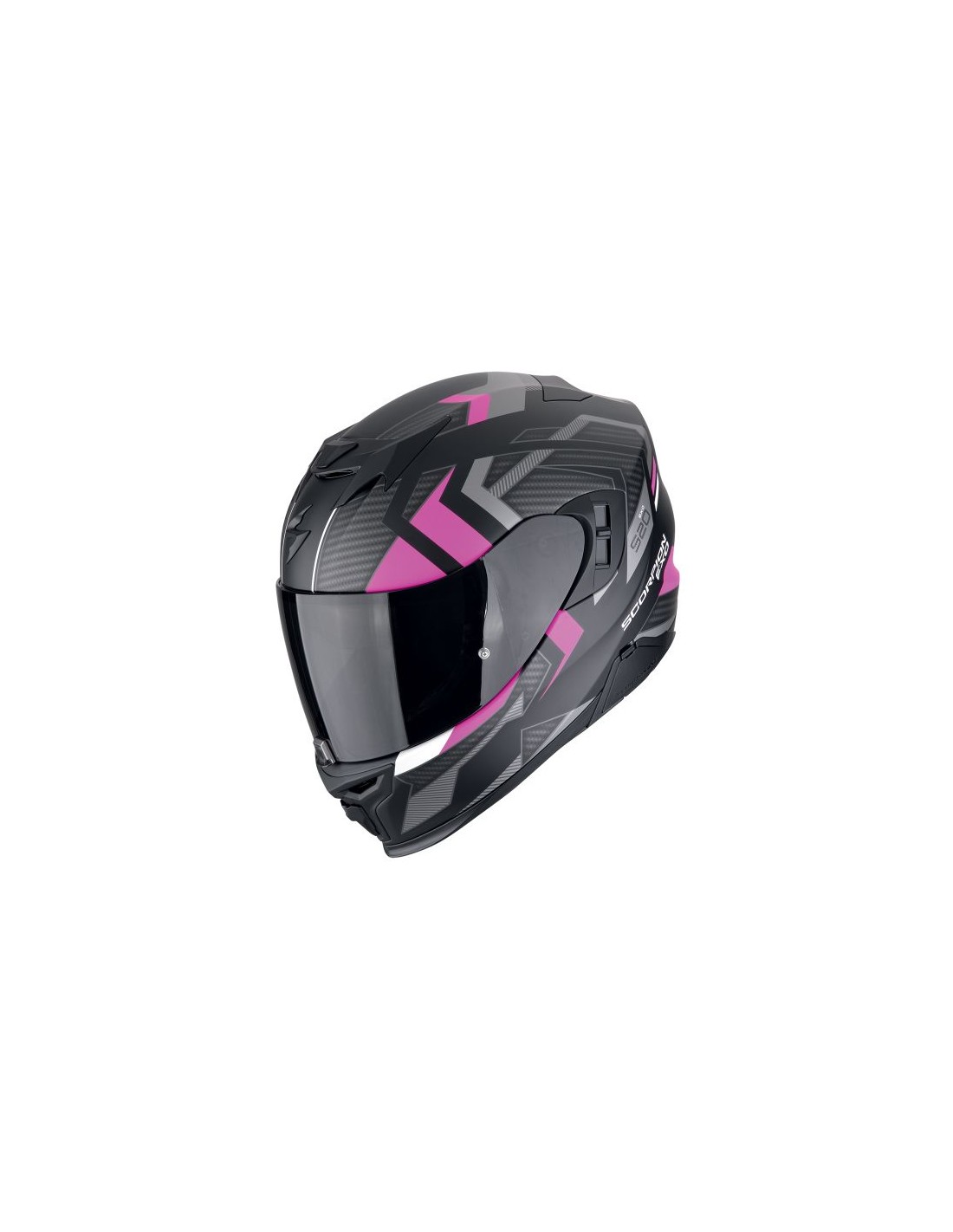 Questo è un casco moto prodotto da SCORPION nel 2024. Il colore è nero e rosa. Consigliato per uso in strada.