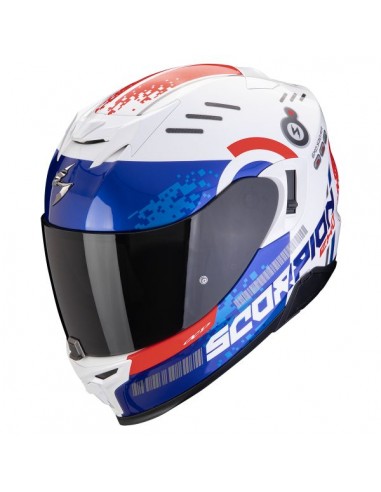 Questo è un casco moto prodotto da SCORPION nel 2024. Il colore è bianco, blu e rosso. Consigliato per uso in strada.