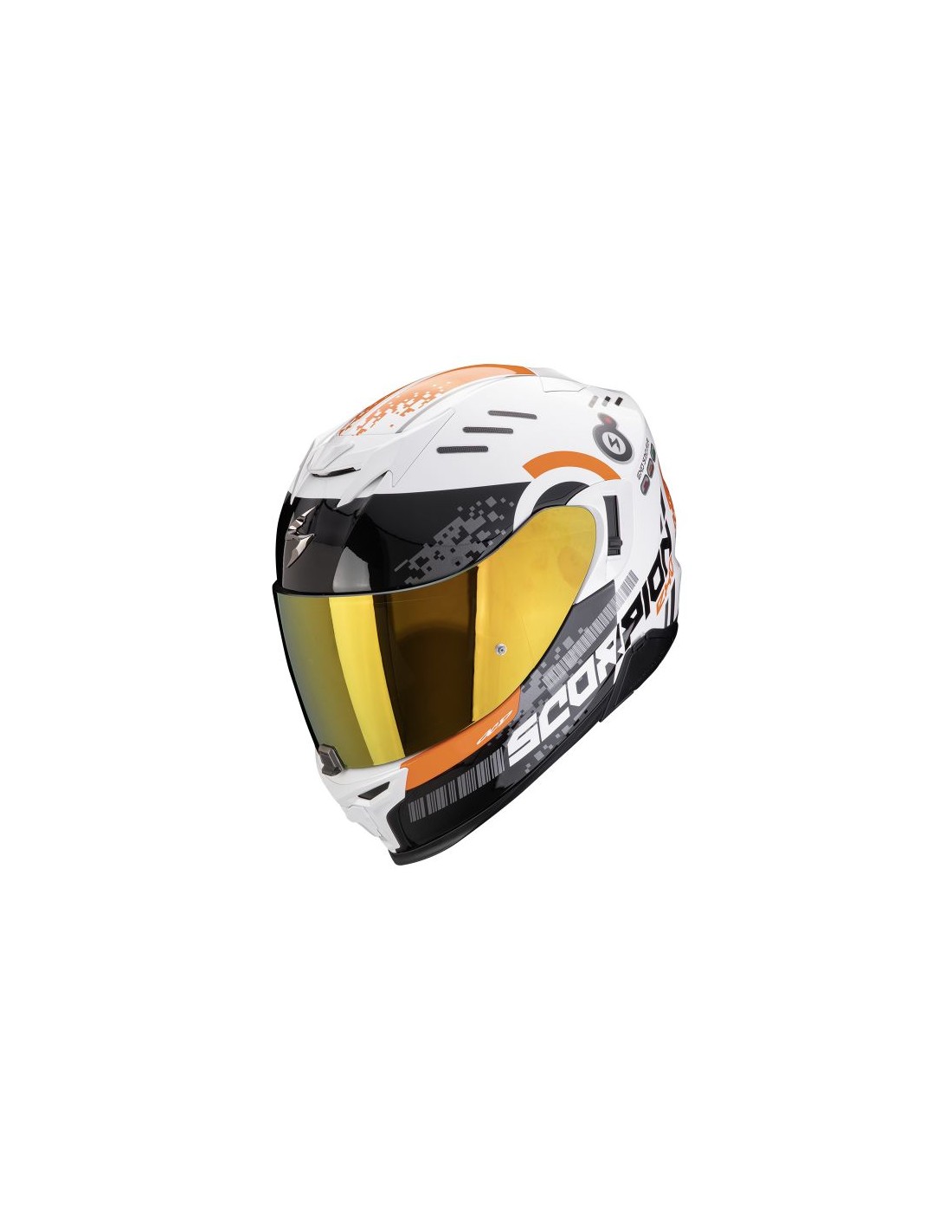 Questo è un casco moto prodotto da SCORPION nel 2024. Il colore è bianco, nero e arancione. Consigliato per uso in strada.